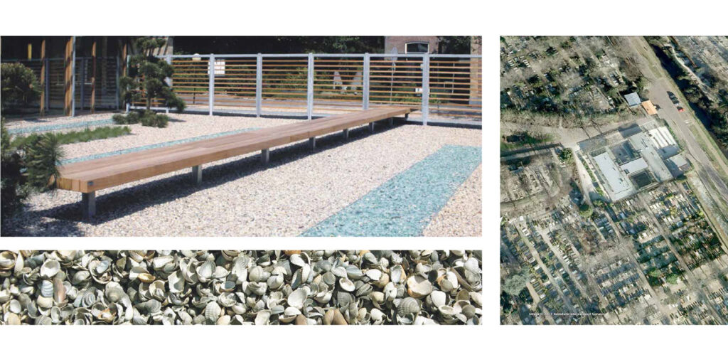 Een bijzonder kenmerk van het ontwerp is de lange zitbank, die vanuit de patio doorloopt naar de openbare ruimte. Deze bank symboliseert het leven buiten de poorten van het uitvaartcentrum, dat ondanks alles altijd zijn natuurlijke loop vervolgt. Het is een subtiele, maar betekenisvolle verwijzing naar de onvermijdelijke voortgang van het leven, zelfs na het verlies van een dierbare.