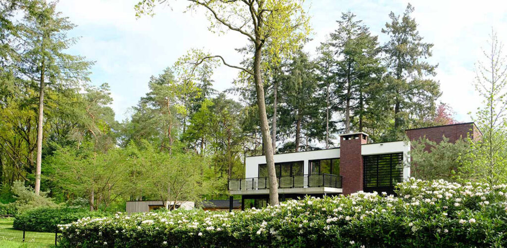 In het tuinontwerp speelt het achterliggende bos een belangrijke rol. Door het bos ruimtelijk te betrekken bij de tuin, lijkt de tuin breder dan de erfgrens doet vermoeden. Het gebruik van steeds natuurlijker plantmateriaal richting de erfgrens versterkt dit effect en creëert een harmonieuze overgang tussen tuin en bos.