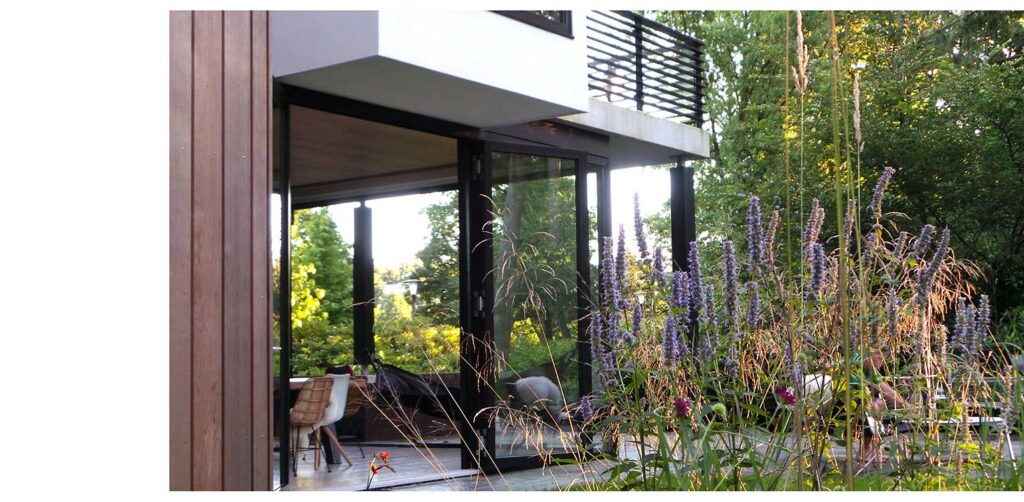 Om deze uitdaging aan te gaan, werden groepen rhododendrons aangeplant. Deze planten zorgen niet alleen voor een vloeiende overgang naar het omliggende bos, maar bieden ook de nodige privacy voor de verschillende terrassen. Het kleurenschema van de borders is zorgvuldig gekozen, geïnspireerd door een kleurrijk tapijt in de woonkamer.