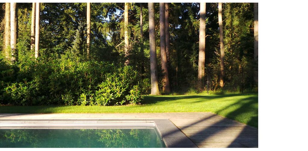Bossfeer villatuin Ugchelen. De start van dit project verliep anders dan gebruikelijk. Bij aanvang waren zowel het zwembad als een groot deel van de verhardingen al gerealiseerd. Dit bracht een unieke uitdaging met zich mee: hoe zorg je ervoor dat het groen de diverse bouwvolumes op een natuurlijke en aangename manier inpast?