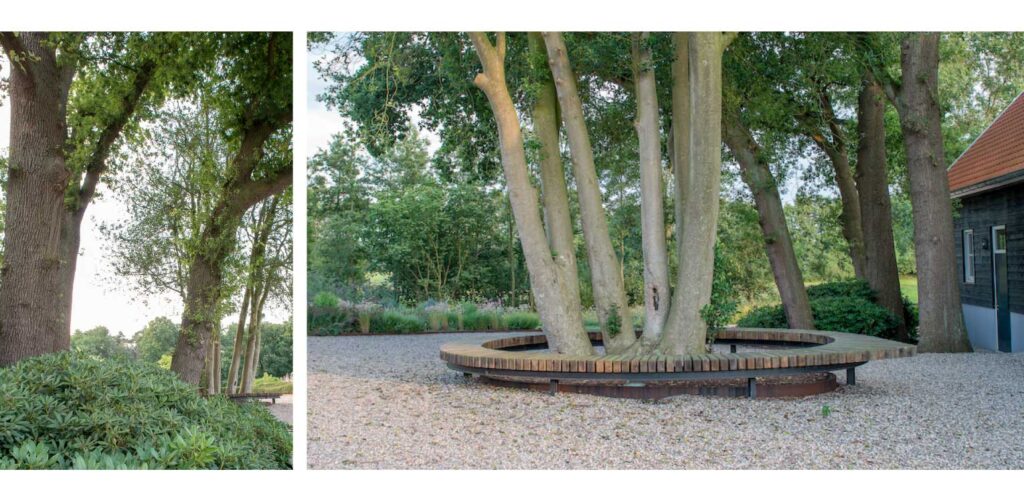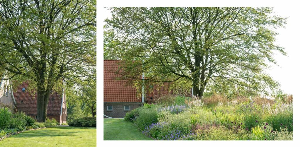 De nieuwe woning is deels gebouwd op de locatie van een oude schuur. Hierdoor blijven de karakteristieke bomen op het erf behouden. Het erf behoudt zijn speelse inrichting, waarbij de gebouwen in een driehoek liggen. De oude boerderij, gelegen aan de oprit met nieuwe lindes, blijft het visuele hoofdgebouw.