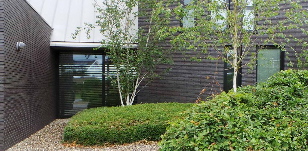 Doordachte landschapstuin Hengelo. Een bewuste keuze in het tuinontwerp was het laag en breed benadrukken van de erfgrens. Dit is gedaan door middel van beuken snoekvormen, die zorgen voor een vloeiend verloop in zowel breedte als hoogte. Deze snoeivormen creëren een intieme sfeer aan de entreezijde van de woning. In een losse setting zijn nog een aantal witte berken aan de voorzijde toegevoegd. Deze contrasteren met hun witte bast mooi met de donkere gevelsteen.