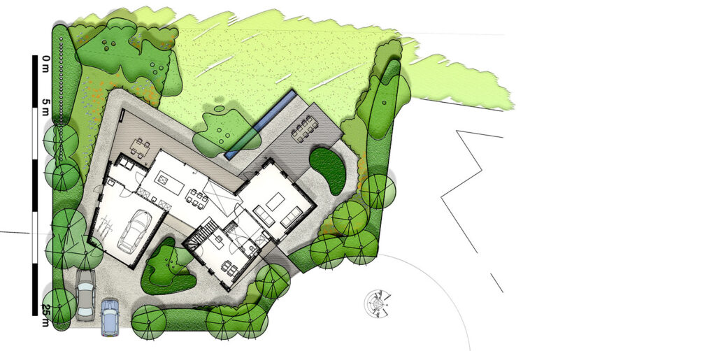 Een solitaire boom naast de spiegelvijver zorgt voor dieptewerking richting het open achterland. Deze strategische beplanting versterkt het gevoel van verbinding met het omliggende landschap. De beplantingen achter de woning zijn landschappelijk van aard, wat de belangrijke en gewenste aansluiting met de natuurlijke omgeving compleet maakt.