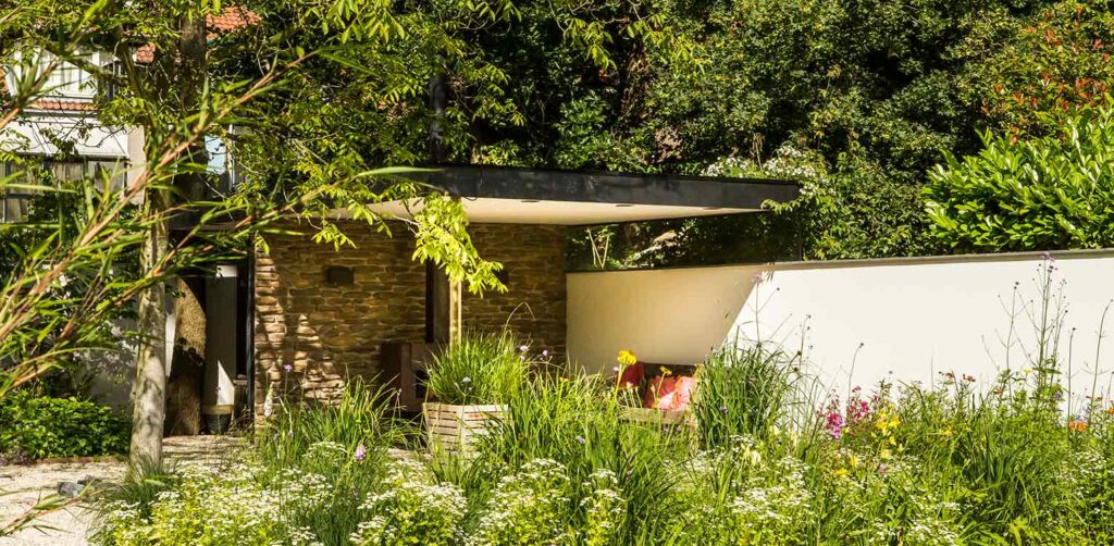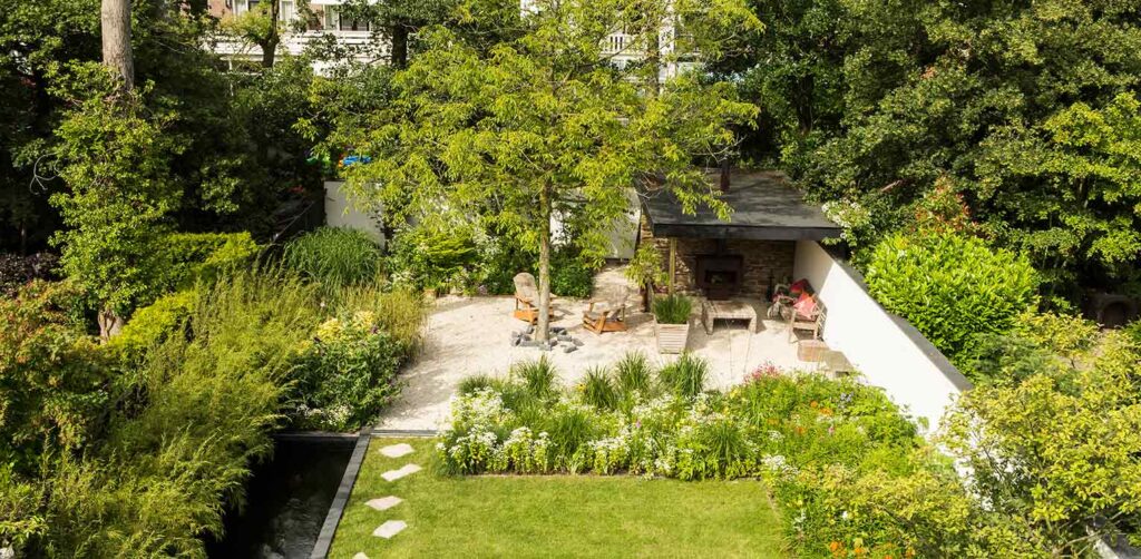 - stadstuin, vijver, vaste planten border, koivijver, overkapping