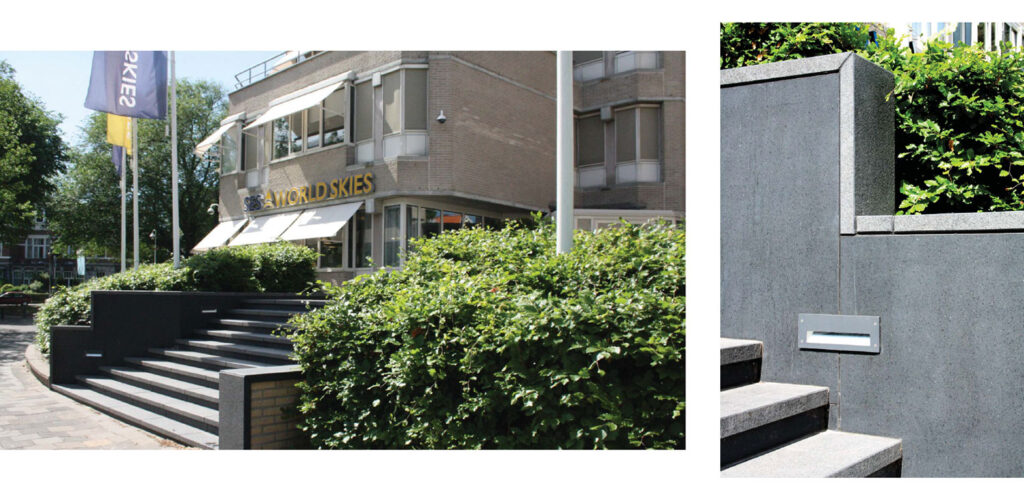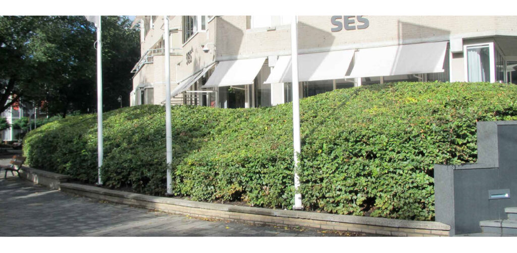 Golvende bedrijfstuin Den Haag. Op het parkeerdek van het Rooseveltplantsoen in Den Haag bevinden zich de kantoren van SES en NWB/Bank. Dit parkeerdek, dat beide bedrijven delen, wordt omringd door een smalle plantstrook. Deze groene strook loopt langs de randen van het parkeerdek, aan weerszijden van de entree trappartij.