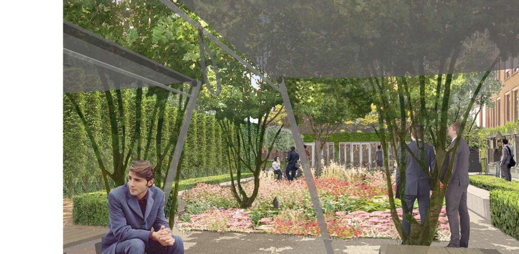 Het lijnenspel in de tuin zorgt voor een steeds wisselend beeld, dat vanuit de diverse verdiepingen van de gebouwen te zien is. Deze opzet biedt een scala aan gebruiksmogelijkheden. Of je nu alleen of met collega’s bent, de tuin nodigt uit om in stijl van het buitenzijn te genieten.