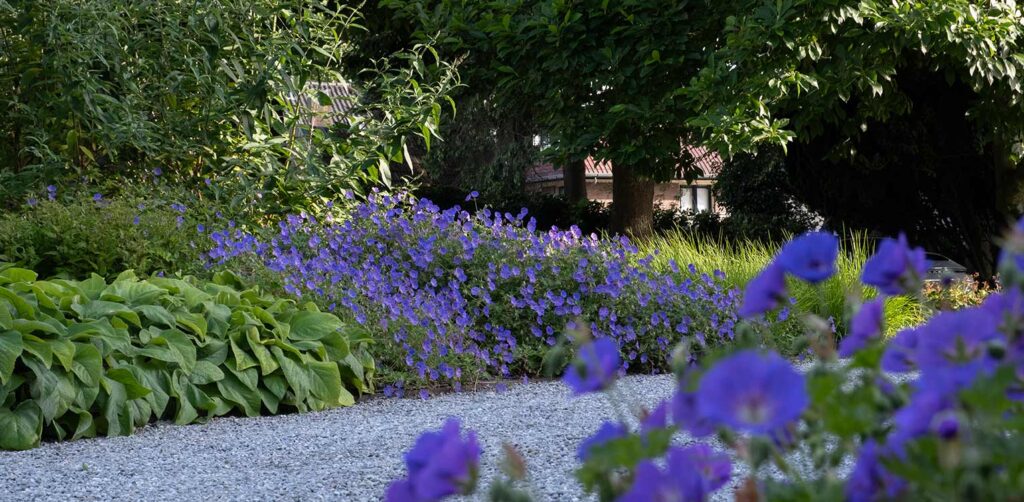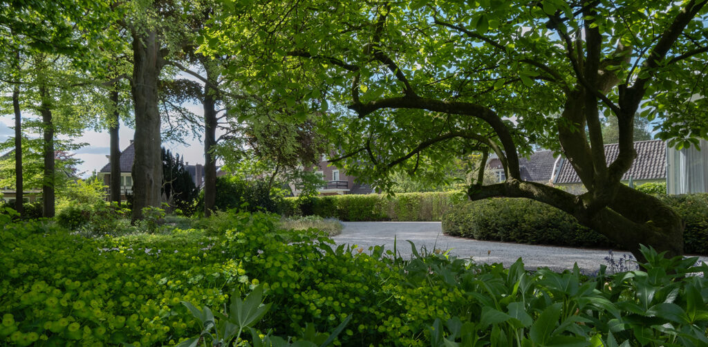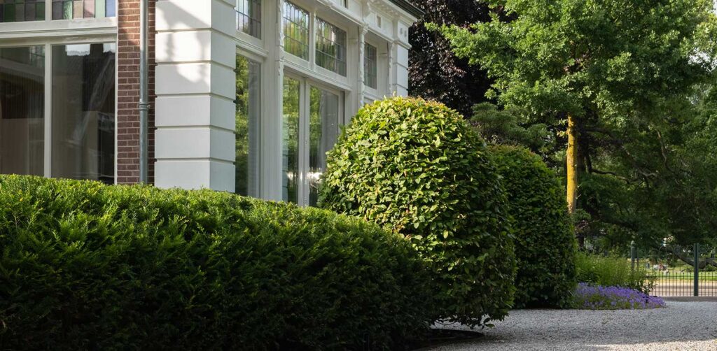 Dicht bij het kantoor is gekozen voor een strakkere beplanting. Hier domineren wintergroene soorten, wat zorgt voor een representatief en verzorgd beeld – ook in de wintermaanden. Deze overgang tussen strak en los maakt het ontwerp functioneel én aantrekkelijk.