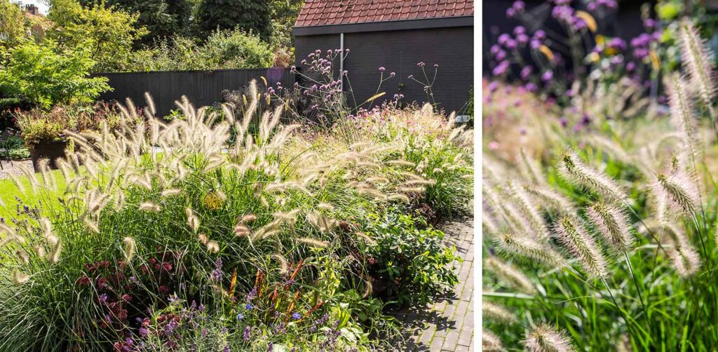 Een subtiel hoogteverschil van slechts 12 centimeter speelt een cruciale rol in de beleving van de tuin. Dit verschil creëert diepte en voegt extra dimensie toe aan de ruimte. De combinatie van strakke ontwerp-lijnen en losse, kleurrijke beplanting zorgt voor een dynamisch geheel dat voortdurend verandert met de seizoenen.