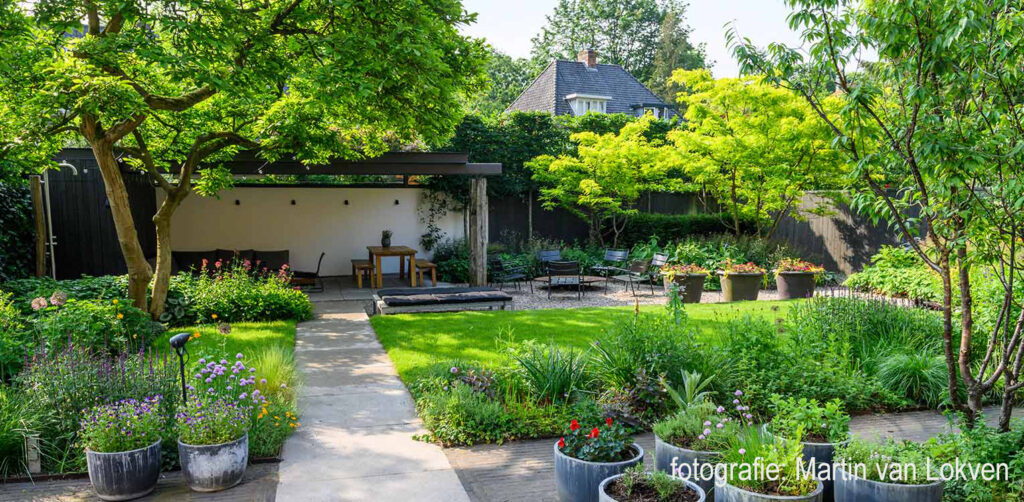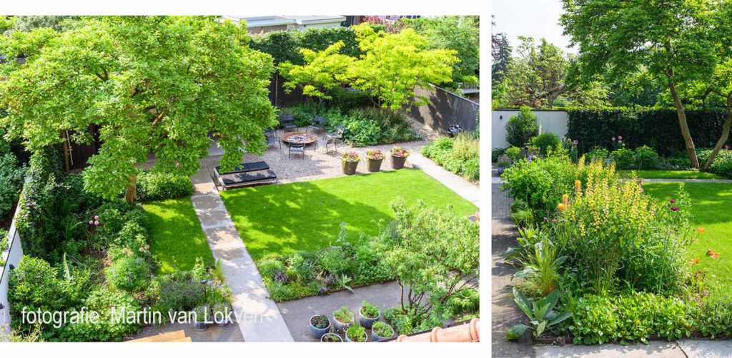 Twee looplijnen verbinden de woning met de terrassen achterin de tuin. Deze paden doorkruisen een groen middengebied, dat dient als buffer tussen de verschillende zones in de tuin. Ondanks de beperkte ruimte zorgt deze slimme indeling voor een groene, rustgevende sfeer. Er is op elk moment van de dag een geschikte plek om te genieten van de tuin.