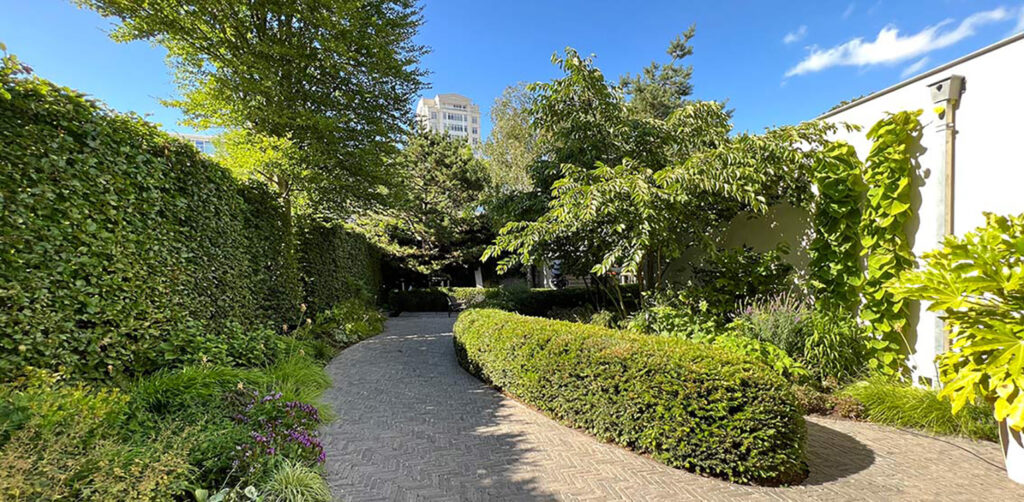 Een belangrijke keuze in het ontwerp was het gebruik van twee centraal geplaatste, gebogen taxushagen. Deze hagen variëren subtiel in breedte en hoogte, wat zorgt voor een vloeiende beweging door de ruimte. Ze vormen de ruggengraat van de tuin en begeleiden bezoekers op een natuurlijke manier door de ruimte. Daarnaast zijn er enkele karaktervolle Pinus solitairen toegevoegd in het achterterrein. Deze wintergroene bomen spelen een cruciale rol in het verbergen van de hogere achterliggende bebouwing.