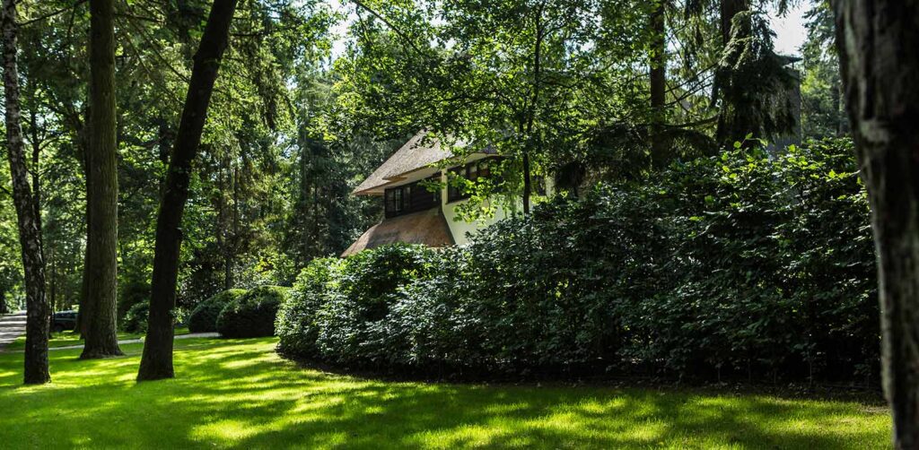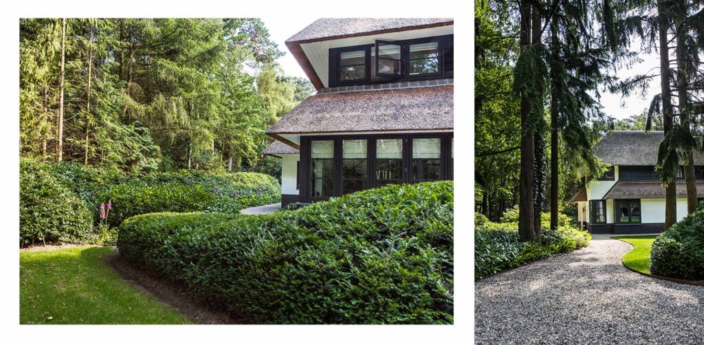 Klassieke bostuin Apeldoorn. Aan de rand van Apeldoorn, grenzend aan de uitgestrekte bossen van de Kroondomeinen, ligt een unieke bostuin die perfect aansluit bij het omliggende natuurschoon. De uitdaging was om twee afzonderlijke percelen, elk met eenvoudige jaren 70-bebouwing, samen te voegen tot één harmonieuze kavel. Dit project werd uitgevoerd in lijn met de visie van architect Marcel de Ruiter, waarbij de oorspronkelijke scheiding tussen de percelen volledig werd weggewerkt.