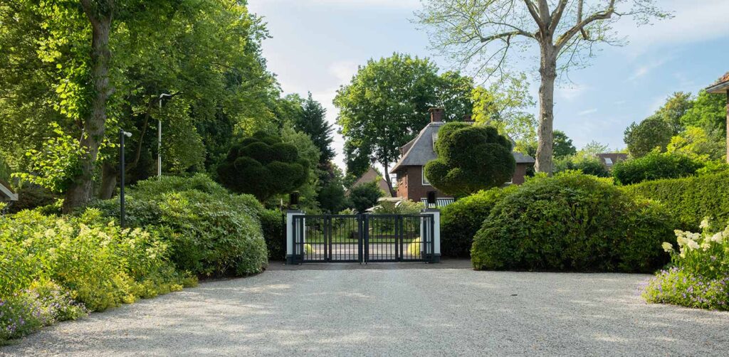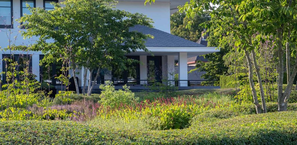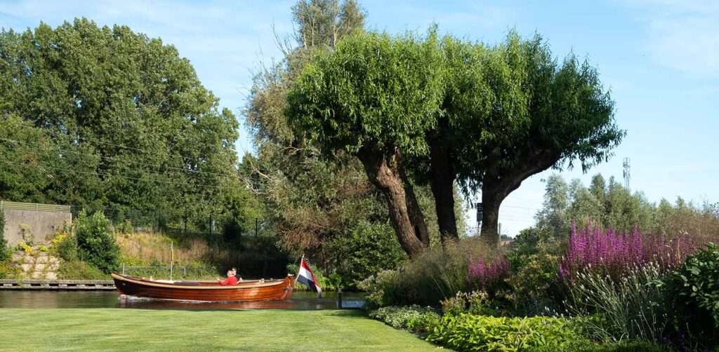 Een ander essentieel punt: het vrije uitzicht op het achterliggende water moest behouden blijven. De vele passerende bootjes vormen een levend schilderij dat men vanuit huis wil blijven zien. Hortensia’s, rhododendrons en azalea’s waren gewenst, maar mochten het zicht niet blokkeren.