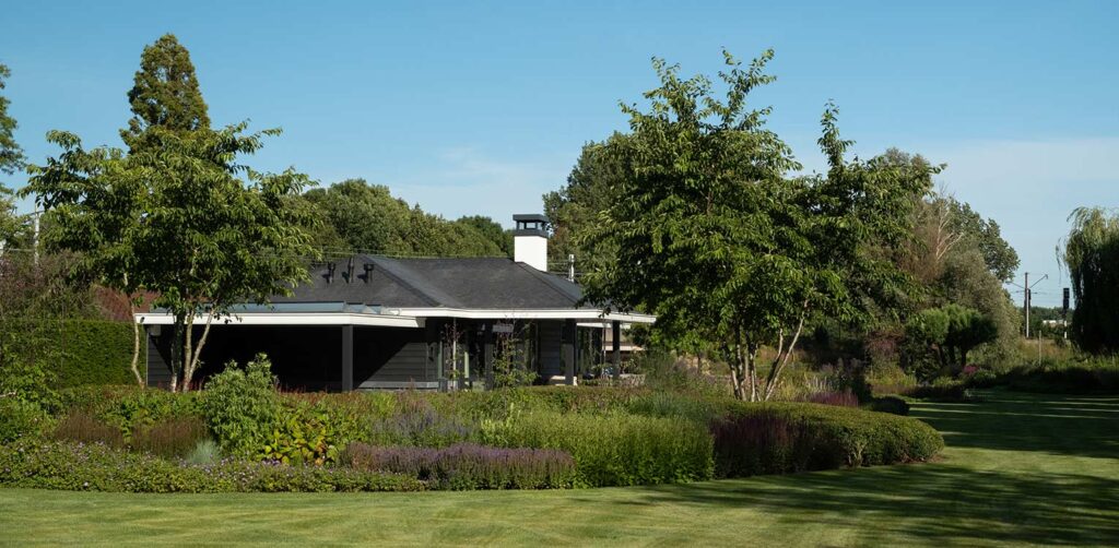 Een bestaande sloot die de tuin doorsneed, is gedempt. Daardoor ontstond niet alleen meer ruimte, maar ook een sterkere lengtewerking in het ontwerp. De tuin oogt groter en dieper. Om de afwatering goed te regelen, zijn drains in het perceel aangebracht.