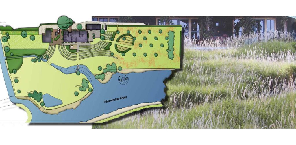 Landschap in ontwikkeling Groede. De tuin in Groede is ontworpen met het doel een natuurlijke en onderhoudsarme omgeving te creëren. Dit ambitieuze project wordt in meerdere fases gerealiseerd. Een belangrijk aspect is de renovatie van de complete boerderij. Bovendien is het essentieel dat de unieke sfeer van deze locatie in Nederland wordt goedgekeurd door Landschapsbeheer Zeeland. Deze organisatie heeft de afgelopen jaren zorg gedragen voor de aanplant van fruitbomen en het onderhoud van bestaande bomen. Daarnaast hebben zij gezorgd voor de aanplant en het beheer van het riet langs het water.