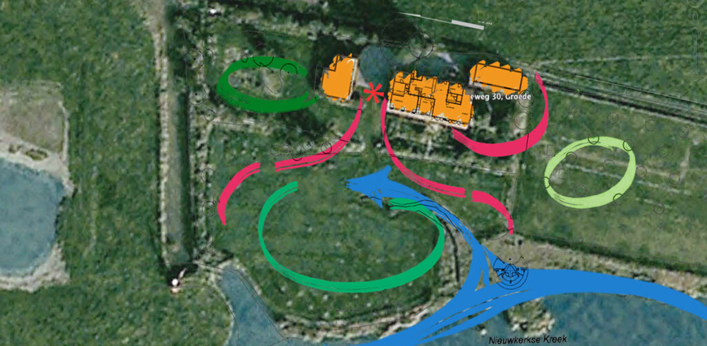 Een deel van de kavel is omgevormd tot een ‘privé’ eiland door een oude, deels verlande kreekarm gedeeltelijk in de oorspronkelijke staat terug te brengen en verder uit te graven. Dit maakt de ligging aan de kreek meer tastbaar en biedt mogelijkheden om de natuurwaarden van deze plek verder door te trekken over de kavel.
