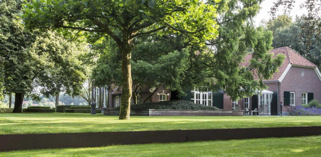 Aan de achterzijde van de tuin zijn grote aanpassingen gedaan. De afwatering was oorspronkelijk willekeurig en zorgde voor onrust. Door het plaatsen van een cortenstalen rand over de gehele breedte van de achtertuin, is een subtiel hoogteverschil gecreëerd. Dit zorgde voor een rustiger en meer samenhangend beeld. Het uitzicht vanuit de boerderij verbeterde aanzienlijk door de zichtlijn over de nieuwe waterspiegel