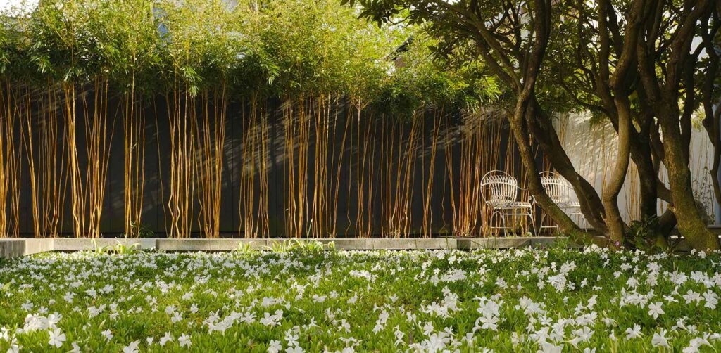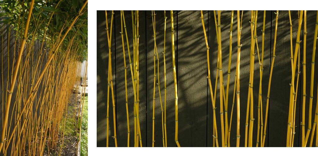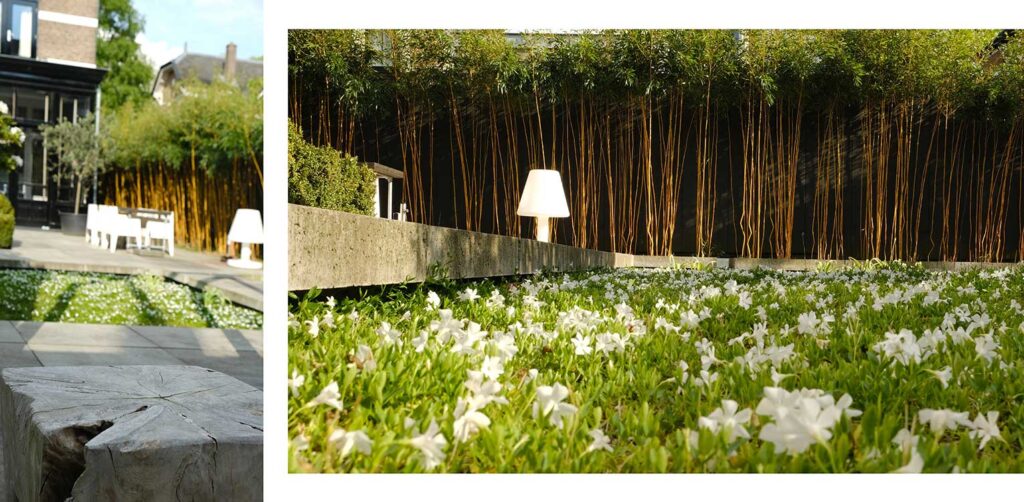 De verbinding tussen het woonhuis en de berging is vormgegeven door een lange, antracietgrijze verticale lattenwand. Voor deze wand zijn bamboes met gele stengels geplant (Phyllostachys aureosulcata ‘Aureocaulis’). Door de onderste zijtakken te verwijderen, ontstaat een fraai grafisch beeld. Het frisse groene loof van de bamboe vormt een mooi contrast met de donkere wand.