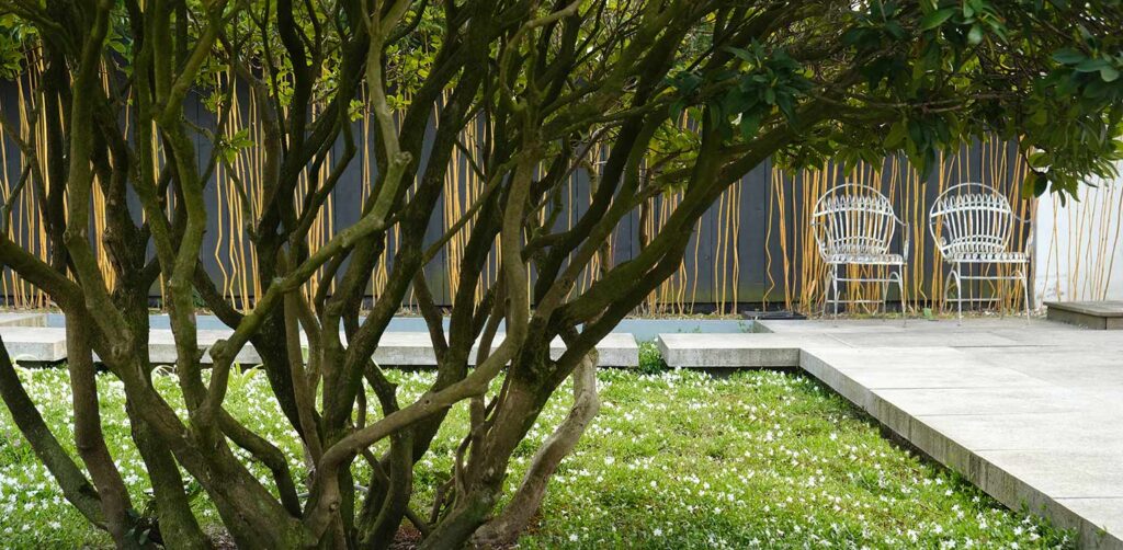 Centraal in deze stadstuin staat een imposante, eeuwenoude rhododendron. Deze plant vormt het middelpunt in een verlaagd gedeelte van de tuin, dat strak is omlijst. Dit deel van de tuin is beplant met witte, wintergroene maagdenpalm, wat zorgt voor een serene uitstraling. De strakke lijnen van het ontwerp versterken de moderne esthetiek van de tuin, terwijl de rhododendron de natuurlijke schoonheid benadrukt.