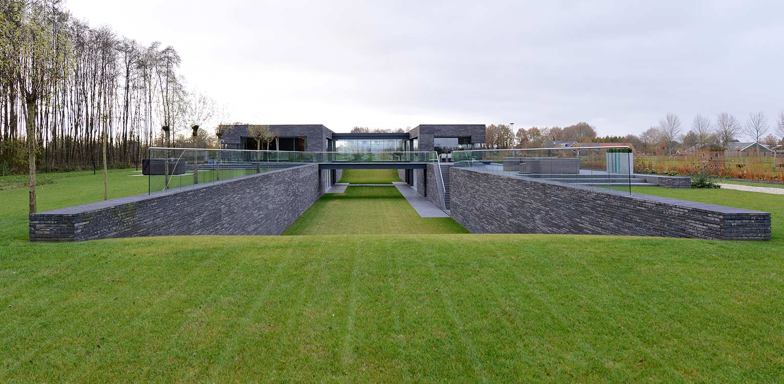 Moderne villatuin Slagenlandschap. Het gebouw bestaat uit twee vleugels, verbonden door een glazen loopbrug en doorsneden door natuur. Het landschap lijkt als het ware onder de woning door te glooien, waardoor de omgeving nauw verweven is met het ontwerp. Deze unieke architectuur zorgt voor een naadloze overgang tussen gebouw en natuur.