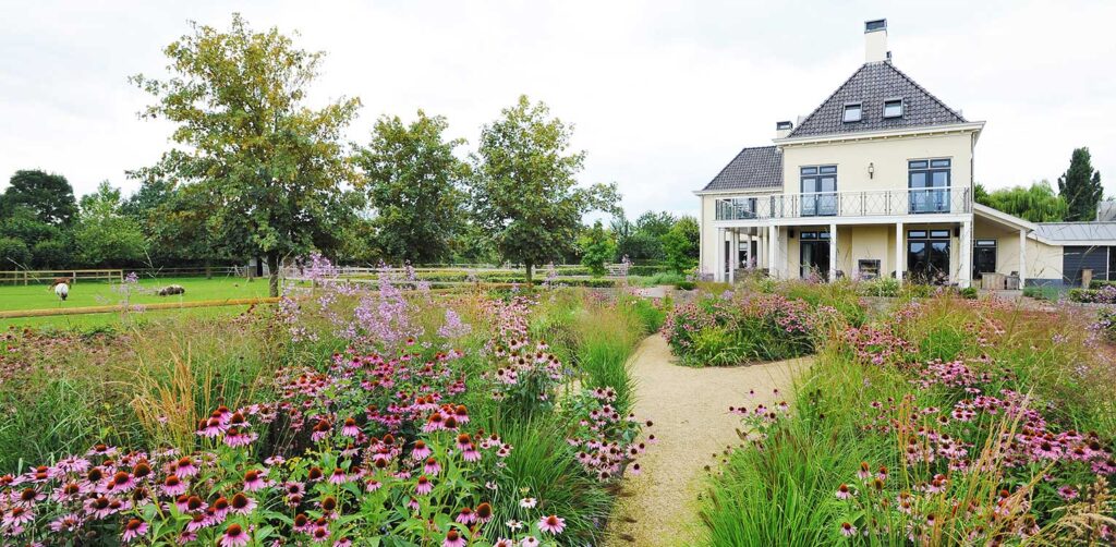Achter de woning strekt zich een indrukwekkende prairietuin uit. Deze tuin vormt een opvallend contrast met de omliggende weilanden en gazons. De bloeiende plantenborders, gecombineerd met speelse halfverhardingspaden, geven de tuin een dynamisch karakter. Deze prairietuin is niet alleen een lust voor het oog, maar zorgt ook voor een levendig schouwspel in de zichtlijn van de woning naar de achterliggende weilanden.