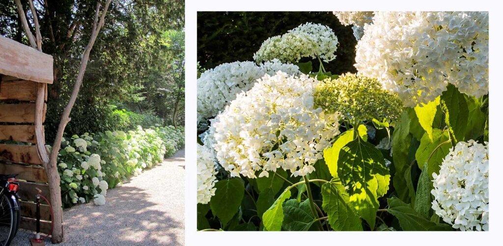 De laurierblobs worden langs de woning doorgetrokken en verbinden zo de voorzijde van de tuin met het achtergelegen grote terras. Dit zorgt voor een vloeiende overgang en eenheid in het ontwerp privacy villatuin Bilthoven. Terwijl de lijnen aan de voorzijde vloeiend en natuurlijk zijn, is het achterterrein strakker vormgegeven. Dit contrast zorgt voor een spannend samenspel tussen de verschillende delen van de tuin. Tegelijkertijd zorgen de gespaarde solitaire bomen voor een natuurlijk tegenwicht. Deze bomen vormen een verbinding met het voorterrein en versterken de eenheid van het tuinontwerp. Een langgerekte prairieborder voegt een belangrijk kleuraccent toe, wat zorgt voor variatie in de groene kleurschakeringen die in dit deel van de tuin domineren.