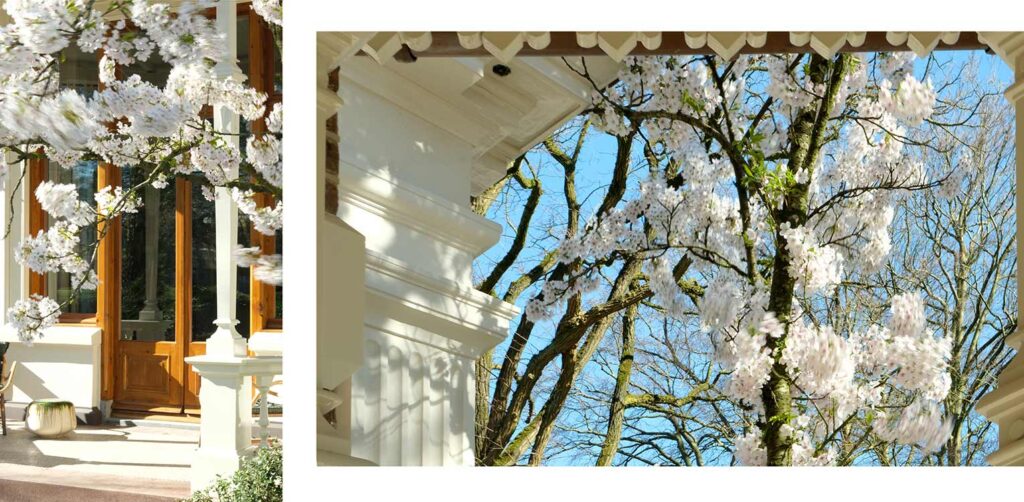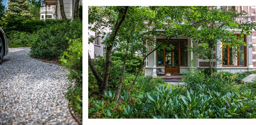 De voortuin, gelegen tegenover het park, is ingetogen vormgegeven. Het lijkt alsof de tuin altijd al zo is geweest. De solitaire bomen in de voortuin sluiten naadloos aan bij het park. De Prunus-bomen zorgen elk voorjaar voor een prachtige bloesem, iets waar de bewoners elk jaar naar uitkijken.