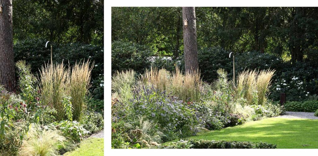Na een grondige opschoonbeurt kwamen diverse volwassen bomen vrij te staan in het grasveld. Dit zorgde voor meer openheid en liet de zon volop schijnen op de kavel. Hierdoor werd de tuin een plek waar je maximaal van de zon kunt genieten. De randen van de tuin zijn vormgegeven met grote groepen rhododendrons en gesnoeide laurierstruiken, die een natuurlijke en elegante uitstraling geven.