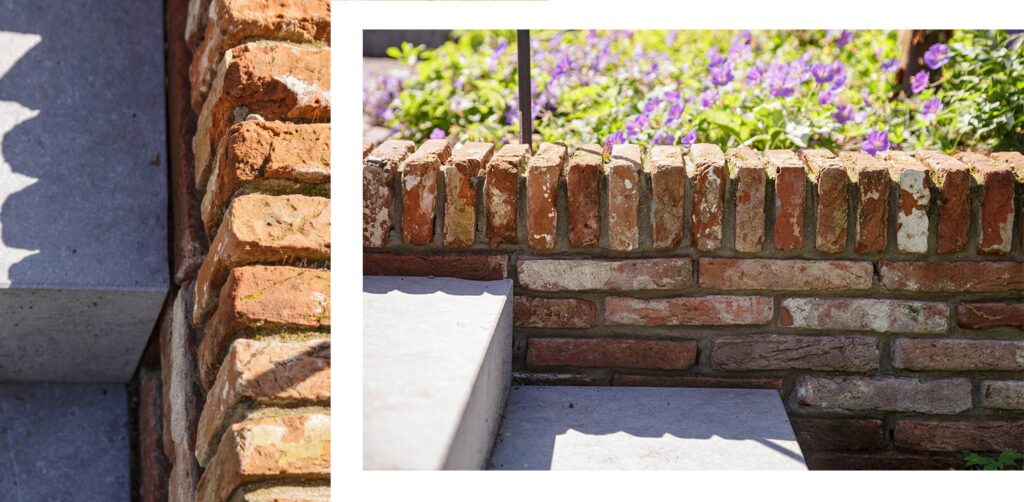 Alle terrassen zijn uitgevoerd in gebakken klinkers, een uitstekende keuze voor buitenruimtes. Gebakken klinkers zijn duurzaam, onderhoudsarm en geven een klassieke look aan je tuin. Voor de traptreden is gekozen voor stijlvolle blokken van natuursteen, wat een elegante afwerking geeft aan de terrassen.