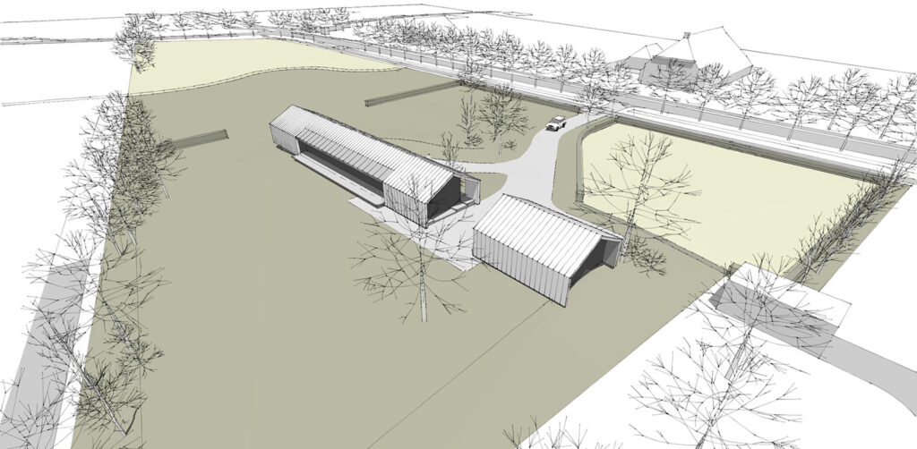 Tijdens de herontwikkeling werd een paardenstal toegevoegd aan het terrein. Deze stal lijkt op een wagon die losgeraakt is van een trein, wat zorgt voor een speelse onderbreking in het ontwerp. De bestaande oprit is behouden, maar heeft nu een lichte slinger. Deze slinger leidt bezoekers vanzelf naar het binnenplaatsje tussen de woning en de paardenstal. Bovendien verbergt deze subtiele bocht de entree van de kelder, waardoor het geheel een opgeruimde en uitnodigende uitstraling heeft.