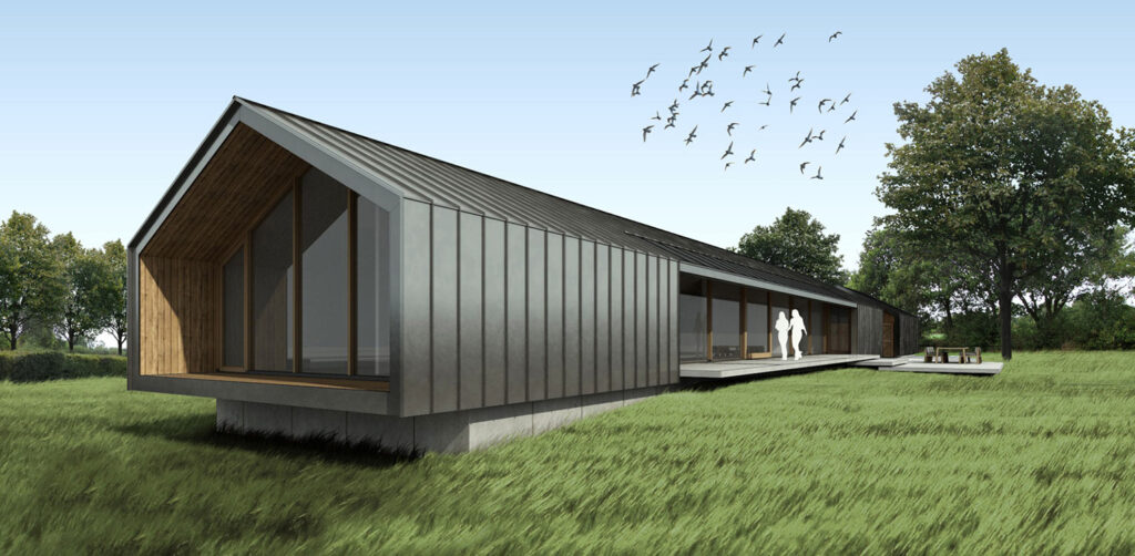 De geslotenheid van de woning aan de straatzijde vormt een sterk contrast met de openheid aan de achterzijde. Hier is een halftransparante tussenruimte gecreëerd die fungeert als overgang naar het zacht glooiende landschap. Deze openheid zorgt voor een naadloze verbinding met de omliggende natuur, waardoor de woning volledig in het landschap opgaat.