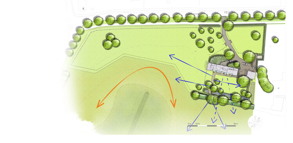 Met deze transformatie is het terrein getransformeerd tot een harmonieuze plek, waar de geschiedenis van het landschap en moderne architectuur elkaar versterken.