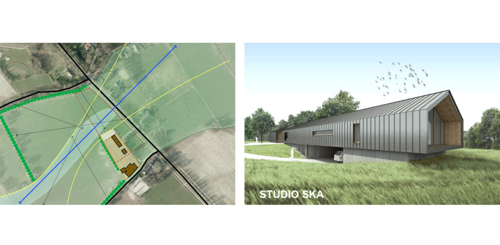 Aan de Zuidlaarderweg stonden tot voor kort diverse opstallen, waaronder een Scandinavisch prefab huis, een oude boerenschuur en enkele grote industriële loodsen. Na de sloop bleven er enkele fraaie oude bomen en een interessante glooiing aan de zuidkant over. De nieuwe bebouwing sluit qua positie aan bij de bestaande gebouwen en de achterliggende houtwal. Hierbij is slim gebruikgemaakt van twee oude bomen: één aan de voorkant en één aan de achterkant. Deze bomen zorgen ervoor dat de lange woning vanaf de straat een gebroken en gevarieerd aanzicht krijgt.