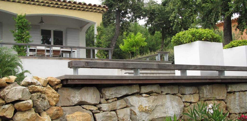 Villatuin vakantiewoning Brignoles. De tuin is een waar kunstwerk. De tuin bestaat uit meerdere terrassen, elk op een ander niveau, waardoor een speels en gelaagd effect ontstaat. De keuze voor buitenparket op vrijwel alle terrassen draagt bij aan een harmonieuze uitstraling. De strakke lijnen en fraaie detailleringen van het parket zorgen voor een visueel aantrekkelijk geheel, dat perfect past bij de natuurlijke omgeving.