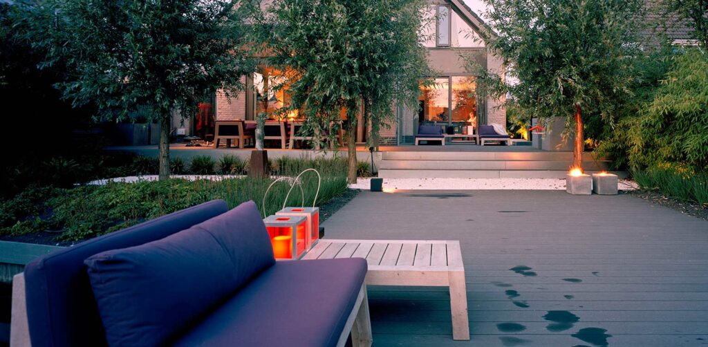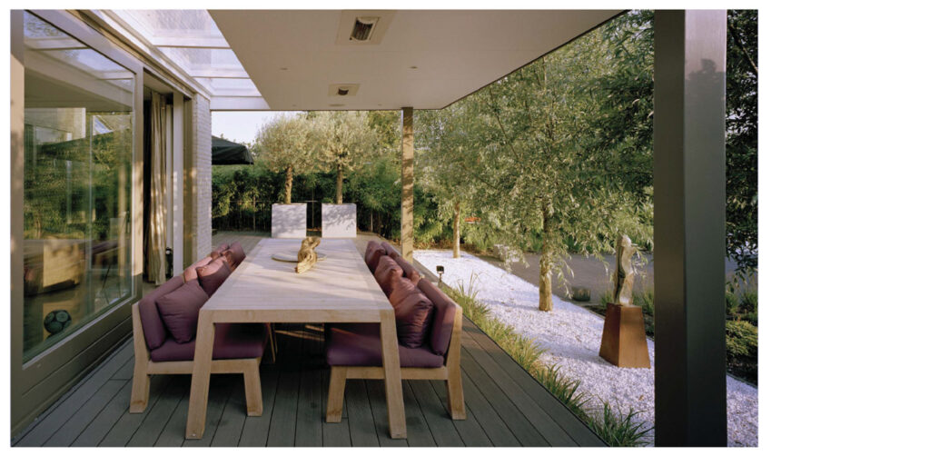 De achterzijde van de tuin is ingericht als een verlengstuk van de binnenruimte. Dit is bereikt door een ruim houten terras aan te leggen dat direct aansluit op de woning. Het terras nodigt uit tot ontspannen en genieten van de omgeving.