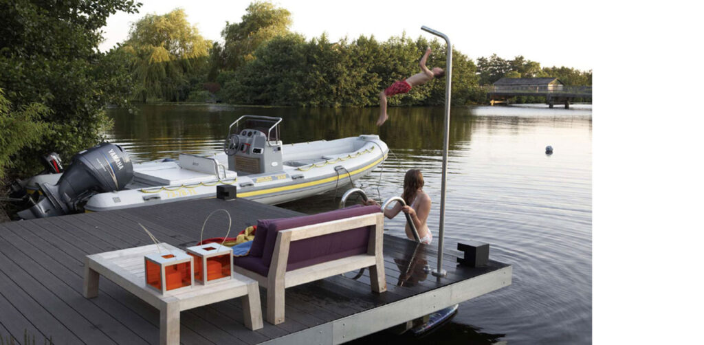 Een bijzonder kenmerk van deze tuin is het doorzichtige scherm van vier knotwilgen. Deze bomen vormen een subtiel eerbetoon aan het omliggende veenweidegebied. Dit natuurlijke element versterkt de verbinding tussen de tuin en de omgeving. Daarnaast is er een steiger en een kleine inham gecreëerd, waardoor het water op een elegante manier de kavel binnenstroomt. Dit ontwerp brengt het rustgevende effect van water dichterbij.
